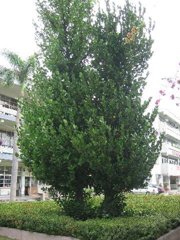 福木是一種小型常綠喬木,樹皮黑褐色,樹枝對生。葉對生,形橢圓,色深綠,背面則為黃綠色,葉片肉質化,平滑有光澤,邊緣全緣。花幾乎無柄,彷彿從樹幹上直接長出。花小而不明顯,呈淡黃色,叢生於枝條的末端。花萼和花瓣各四片。果實初生時為綠色,熟時則為黃色,可食,味道類似榴褳。 福木原產於菲律賓,也產於蘭嶼,耐旱及耐鹽性皆佳,可作為防風林。校園裡實驗大樓旁,種滿整排的福木,煞是壯觀。因其不易掉葉的特性已成為廣受歡迎的行道樹及園藝植物。