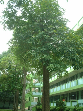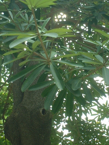 常綠大喬木。樹幹筆直,樹皮呈淺灰褐色,高度可達 25~30 公尺。樹冠呈傘蓋狀,枝條輪生並呈水平狀向外伸展,有白色乳液,具毒性。單葉輪生,呈匙形或倒披針形的長條狀,觸感硬似皮革,表面翠綠,背面則偏白色。葉脈黃色非常明顯,在背面形成凸起。由於葉形長,側脈多達